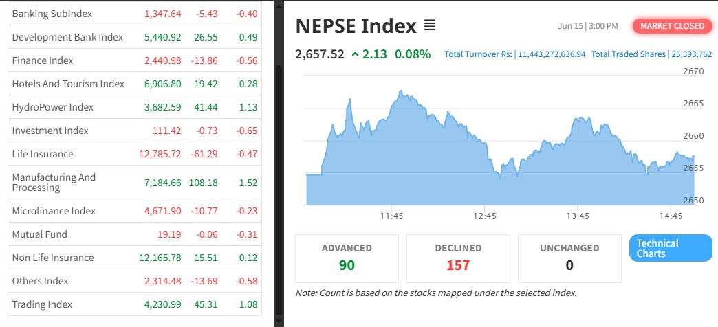 काठमाडौं । साता कारोबारको पहिलो दिन अर्थात आइतबार शेयर बजार झिनो अंकले बढेको छ । आज नेप्से परिसूचक २.१३ अंकले बढेर २६५७ को बिन्दुमा कायम भएको छ । आइतबार सानिमा माई हाइड्रोपावरको सबैभन्दा बढी कारोबार भएको छ । कम्पनीको...