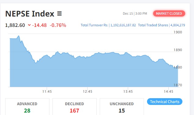 काठमाडौं । बिहिबार शेयरबजारमा दोहोरो अंकको गिरावट आएको छ । आज नेप्से सूचक १४.४८ अंकले घटेर १८८२ विन्दुमा कायम भएको छ । बैंकहरुले आज सार्वजनिक गरेको नयाँ ब्याजदरमा मंसिर महिनाकै ब्याजदर कायम राखेकोले पनि आज शेयरबजार घट्न पुगेको हो...