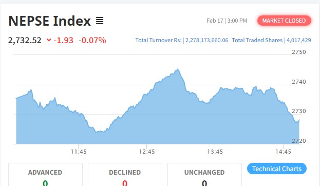काठमाडौं । साता कारोबारको अन्तिम दिन बिहिबार नेप्सेमा सामान्य गिरावट आएको छ । अघिल्लो दिन १९ अंकले घटेको शेयर बजार आज १.९३ अंकले घटेर २७३२.५२ विन्दुमा पुगेको छ । नेप्समा सूचीकृत २२७ कम्पनीको ४० लाख १७ हजार ४२९ कित्ता...